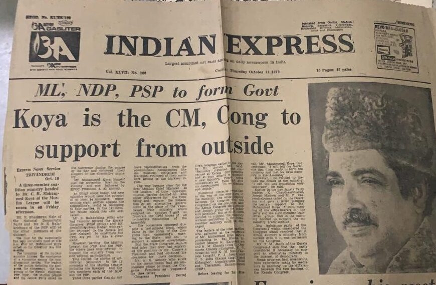മുസ്ലിം ലീഗ്-എന്.ഡി.പി-പി.എസ്.പി സഖ്യം കേരളത്തില് ഗവണ്മെന്റ് രൂപീകരിച്ചതിനെ തുടര്ന്ന് സി.എച്ച് മുഹമ്മദ് കോയ മുഖ്യമന്ത്രിയായി തെരെഞ്ഞെടുക്കപ്പെട്ടു. അദ്ദേഹത്തിന്റെ സത്യപ്രതിജ്ഞ വാര്ത്ത ഇന്ത്യന് എക്സ്പ്രസില് പ്രസിദ്ധീകരിക്കപ്പെട്ടപ്പോള്.