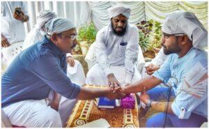വധുവിന്റെ പിതാവും വരനും നികാഹ് വേളയില്‍ ഹസ്തദാനം നടത്തുന്നു. അരികില്‍ നികാഹിന്റെ പദങ്ങള്‍ ചൊല്ലിക്കൊടുക്കുന്ന ഉസ്താദ്. നികാഹിന്റെ സദസ്സുകളില്‍ ഇത്തരം ചൊല്ലിക്കൊടുക്കലും ഏറ്റുചൊല്ലലും അനുപേക്ഷണിയമാണ്. മഹ്‌റ് വസ്തു ഫോട്ടോയില്‍ കാണാവുന്നതാണ്.